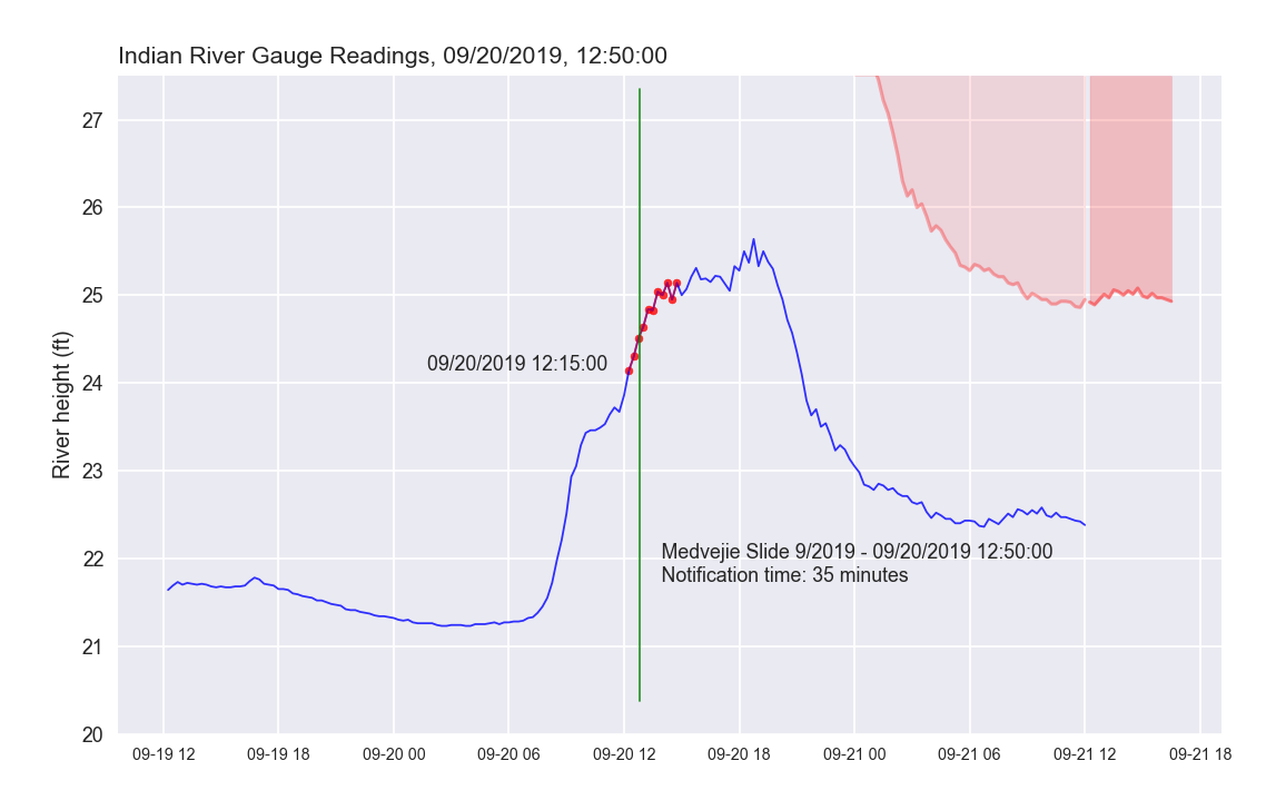 In this image, the critical points are plotted as red dots. The slide is indicated as a vertical green line at the timestamp that matches the best estimate of when the slide occurred. In this event, the slide occurred approximately 35 minutes after the river first reached a critical point.